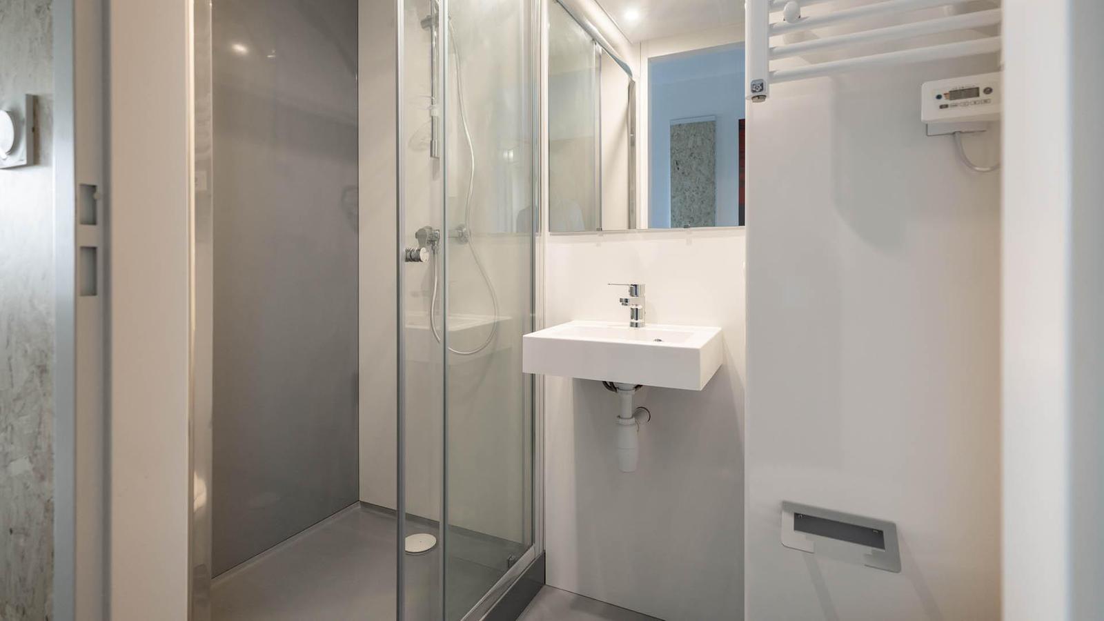 Cette construction adopte une typologie mixte : elle combine des modules 3D bois pour les logements et un rez-de-chaussée ainsi qu’une colonne centrale en béton, tandis que les coursives intérieures sont réalisées en bois CLT. La construction hors-site en modules 3D bois est parfaitement adaptée aux enjeux d’hébergement à haute densité.