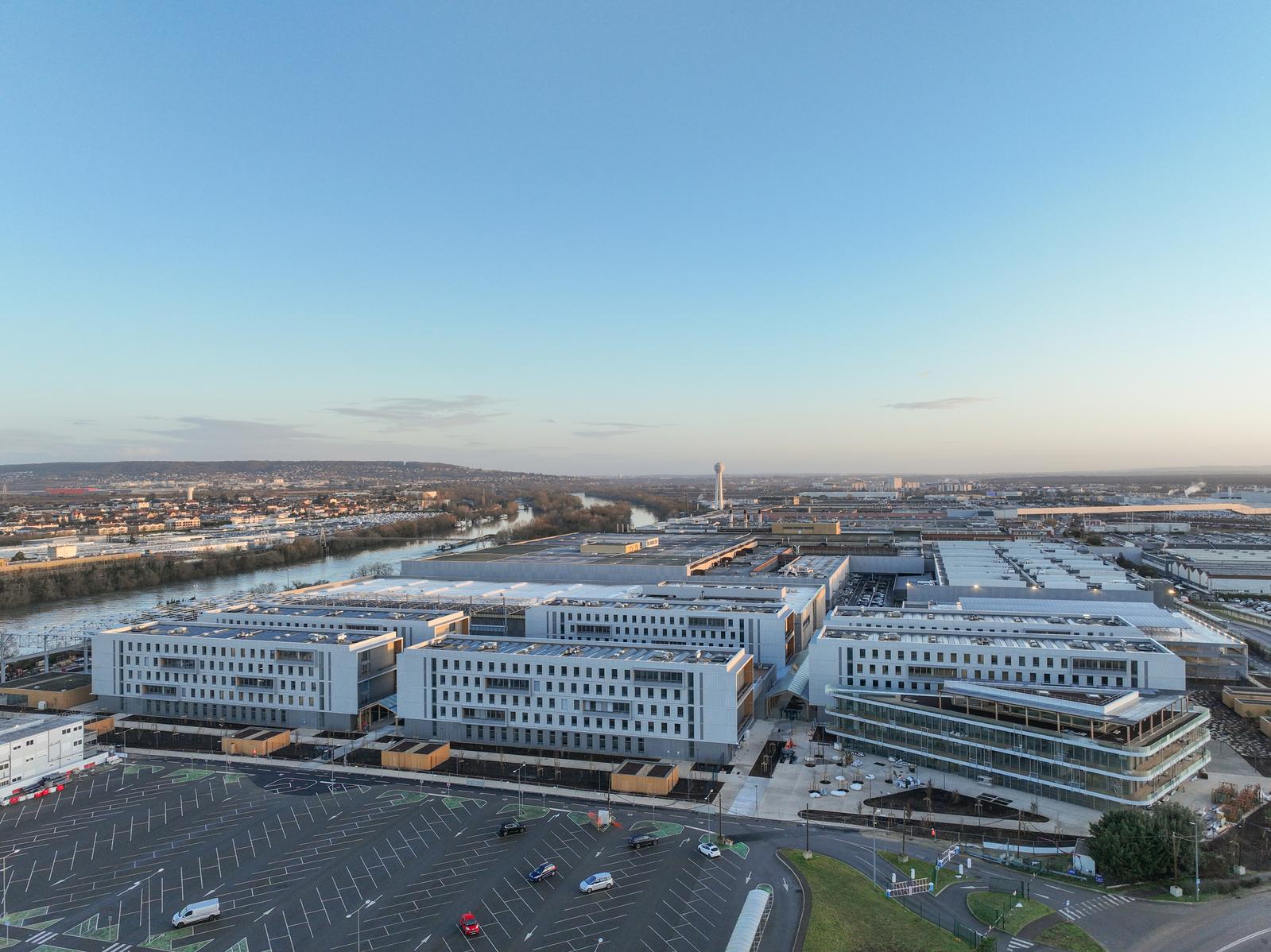 Situé à Poissy, en bord de Seine, le campus comprend 8 bâtiments tertiaires ainsi que des espaces de services et de convivialité, dont un restaurant et un espace de coworking. Conçu pour répondre aux enjeux climatiques actuels, il se distingue par ses ambitions environnementales fortes : conception bioclimatique, optimisation des volumes et des matériaux, et recours à la construction hors-site.
