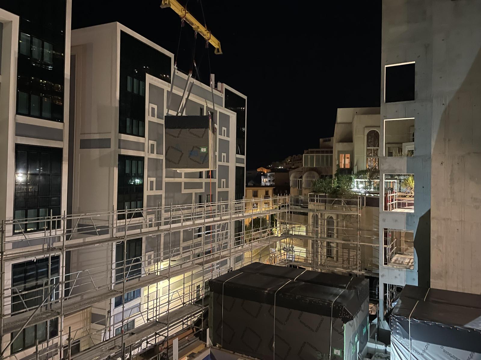 Implanté dans un environnement urbain contraint, entre colline et voirie étroite, le chantier a nécessité une logistique rigoureuse. Le levage nocturne des modules, la mise en place de mesures acoustiques, la gestion des poussières et une coordination précise ont permis de limiter l’impact sur la circulation et les riverains.