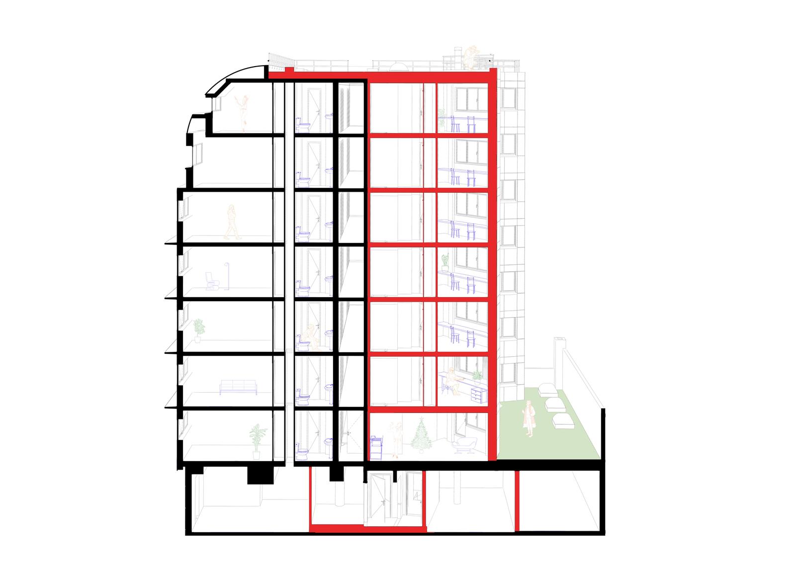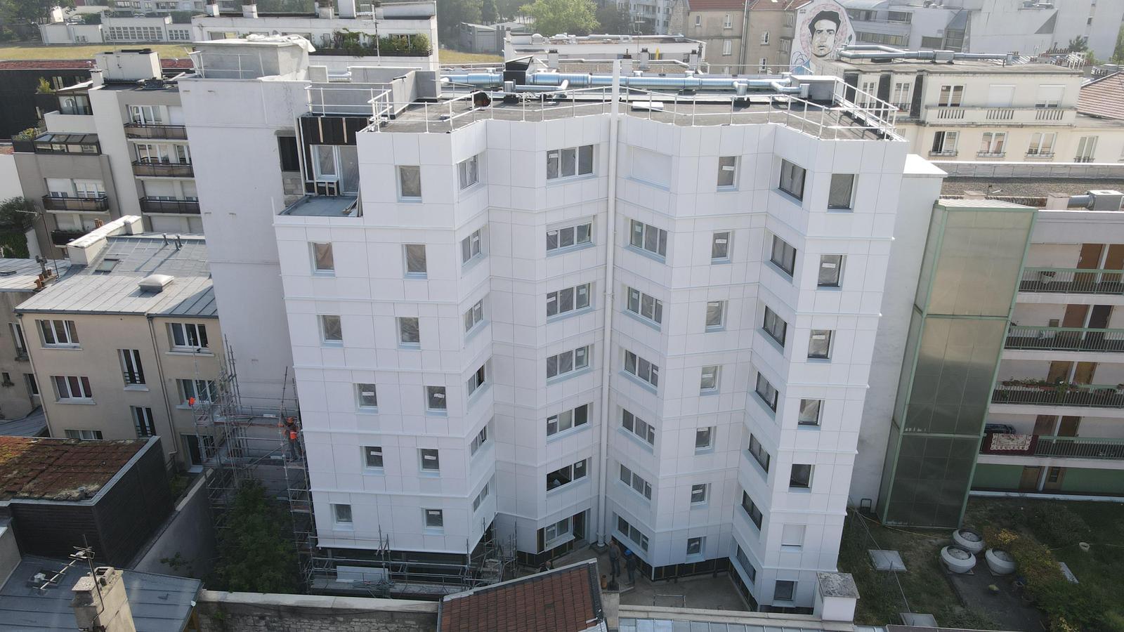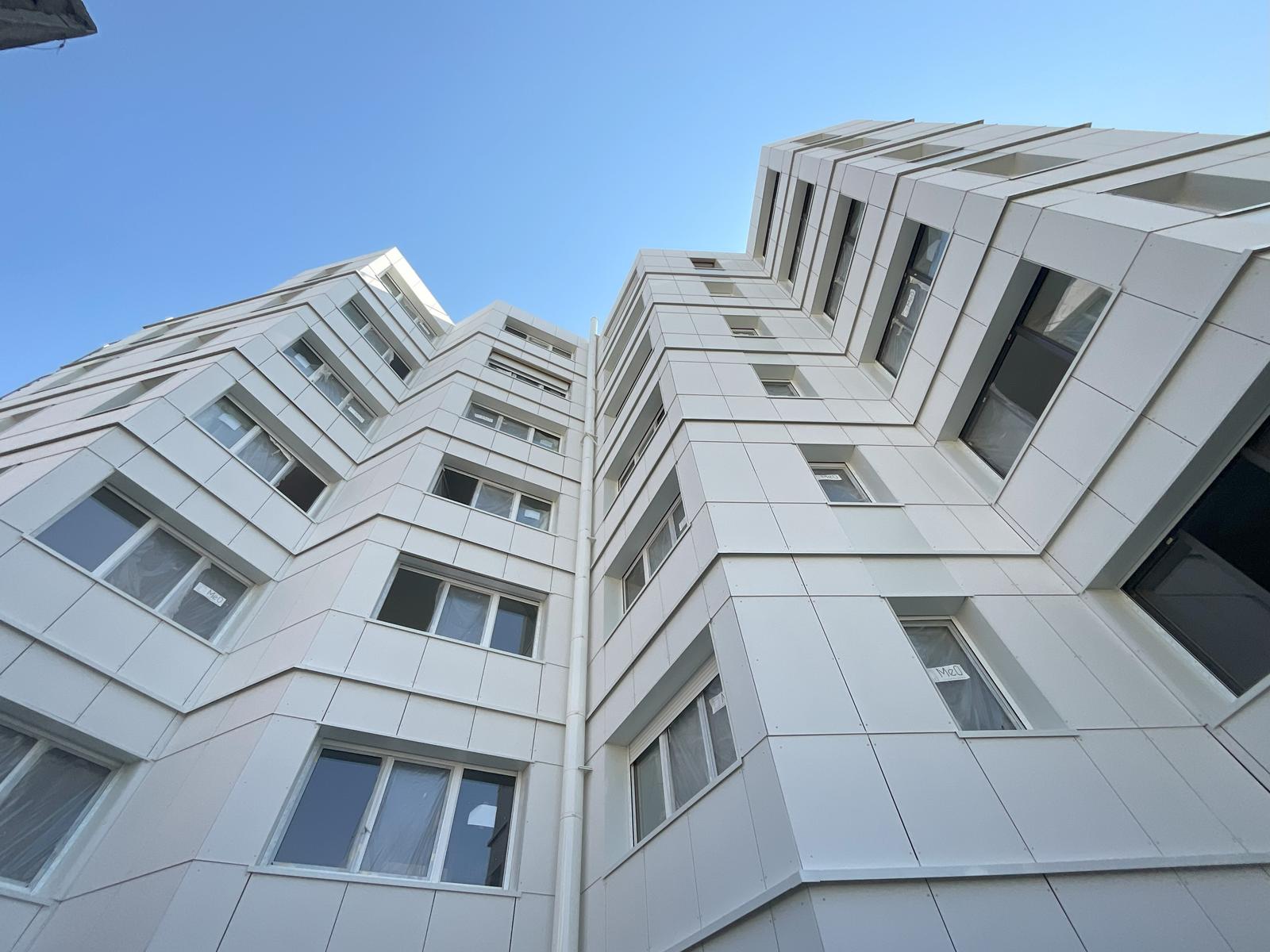 Le nouveau volume, situé en fond de parcelle, se rattache à la coursive qui dessert les 56 studios existants. Sa façade biseautée, en éventail, respecte le gabarit réglementaire tout en offrant une double orientation aux 32 nouveaux studios. L’opération n’a entraîné aucune artificialisation nette des sols.
