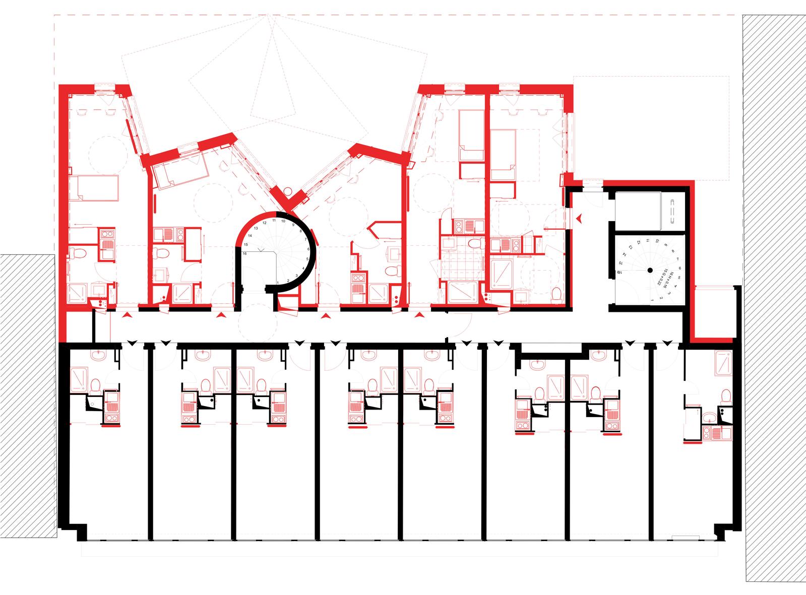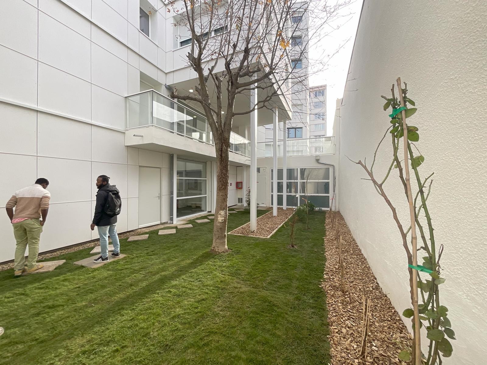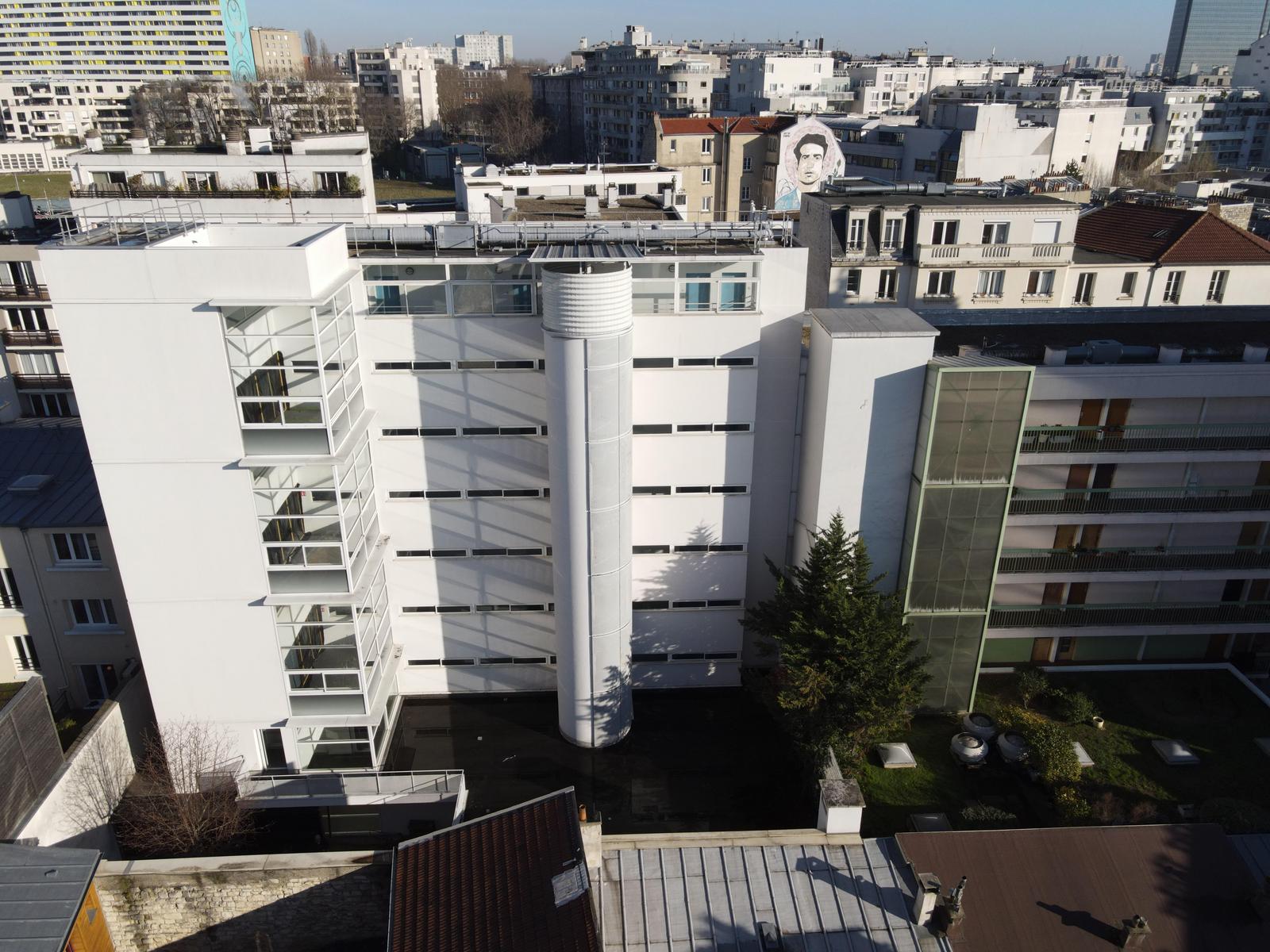 Le nouveau volume, situé en fond de parcelle, se rattache à la coursive qui dessert les 56 studios existants. Sa façade biseautée, en éventail, respecte le gabarit réglementaire tout en offrant une double orientation aux 32 nouveaux studios. L’opération n’a entraîné aucune artificialisation nette des sols.