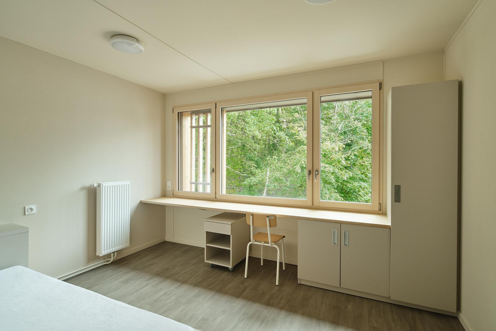 Le projet s’appuie sur un macro-lot modulaire attribué à Ossabois, entreprise spécialisée dans la construction bois hors-site. Au total, 206 modules 3D bois ont été entièrement préfabriqués en usine, dans les Vosges, avant d’être transportés et assemblés sur site. Chaque module intègre la structure, les menuiseries extérieures, les équipements sanitaires, la ventilation double flux, les finitions et le mobilier, garantissant une qualité constante et un haut niveau de performance.