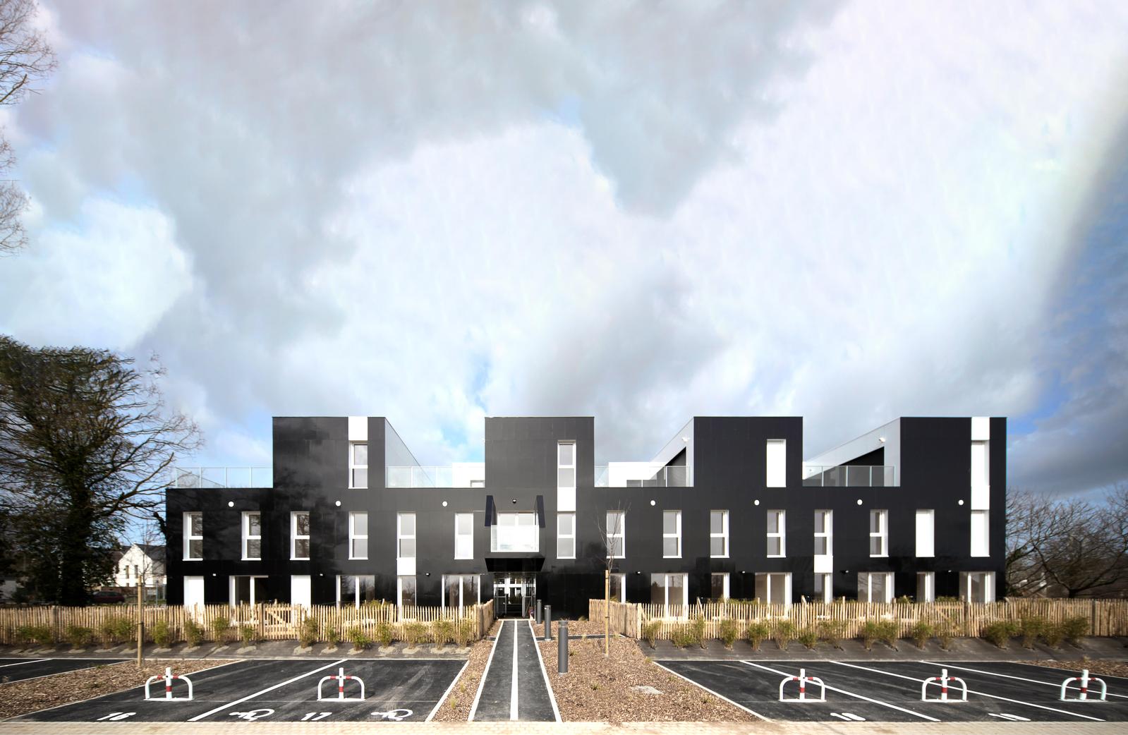 L'écriture architecturale du bâtiment découle de ce travail, puisque la façade sud est largement vitrée, alors que la façade nord présentant les distributions des logements supérieur par le biais des coursives est plus fermée afin de limiter les déperditions thermiques.