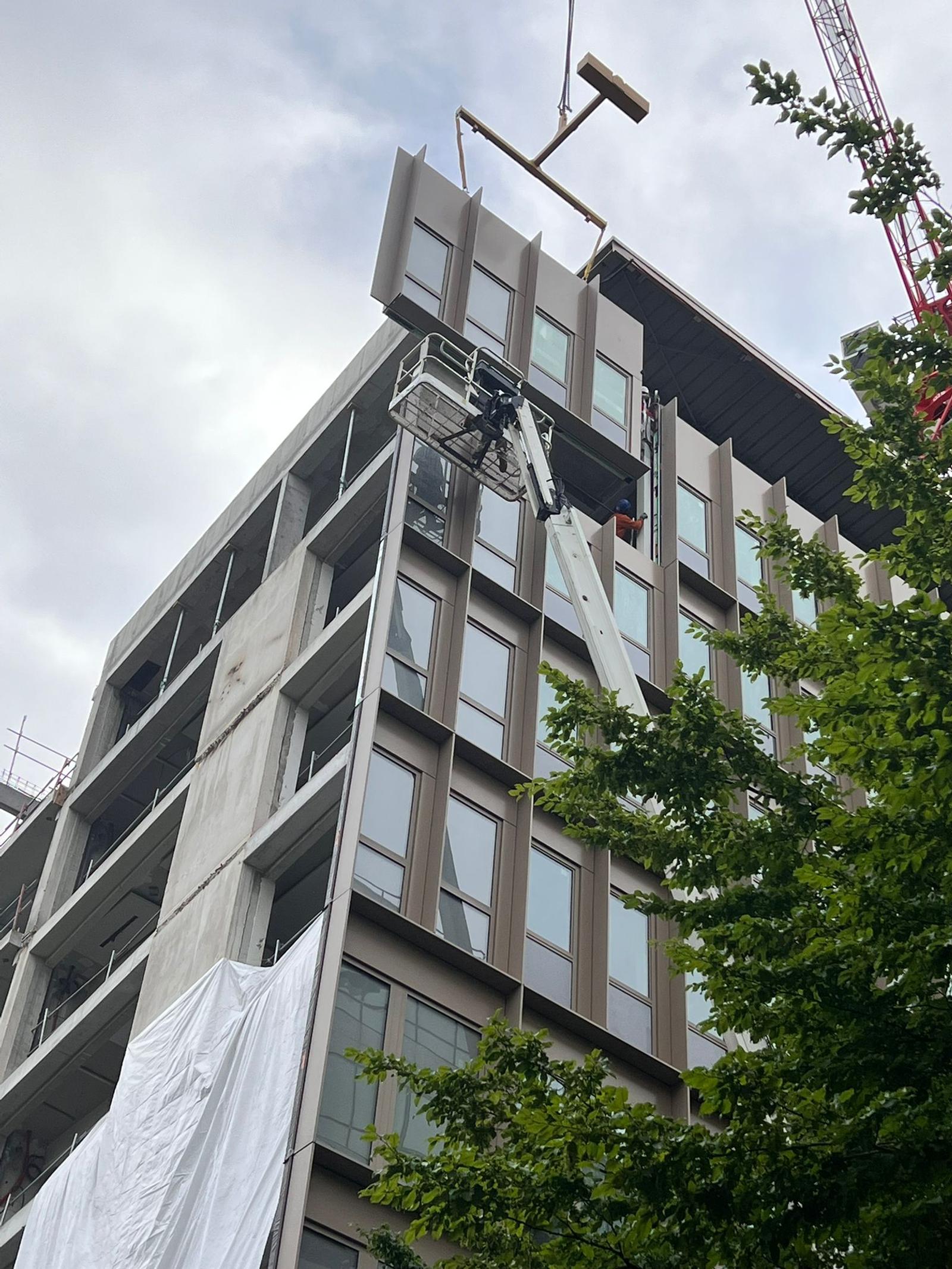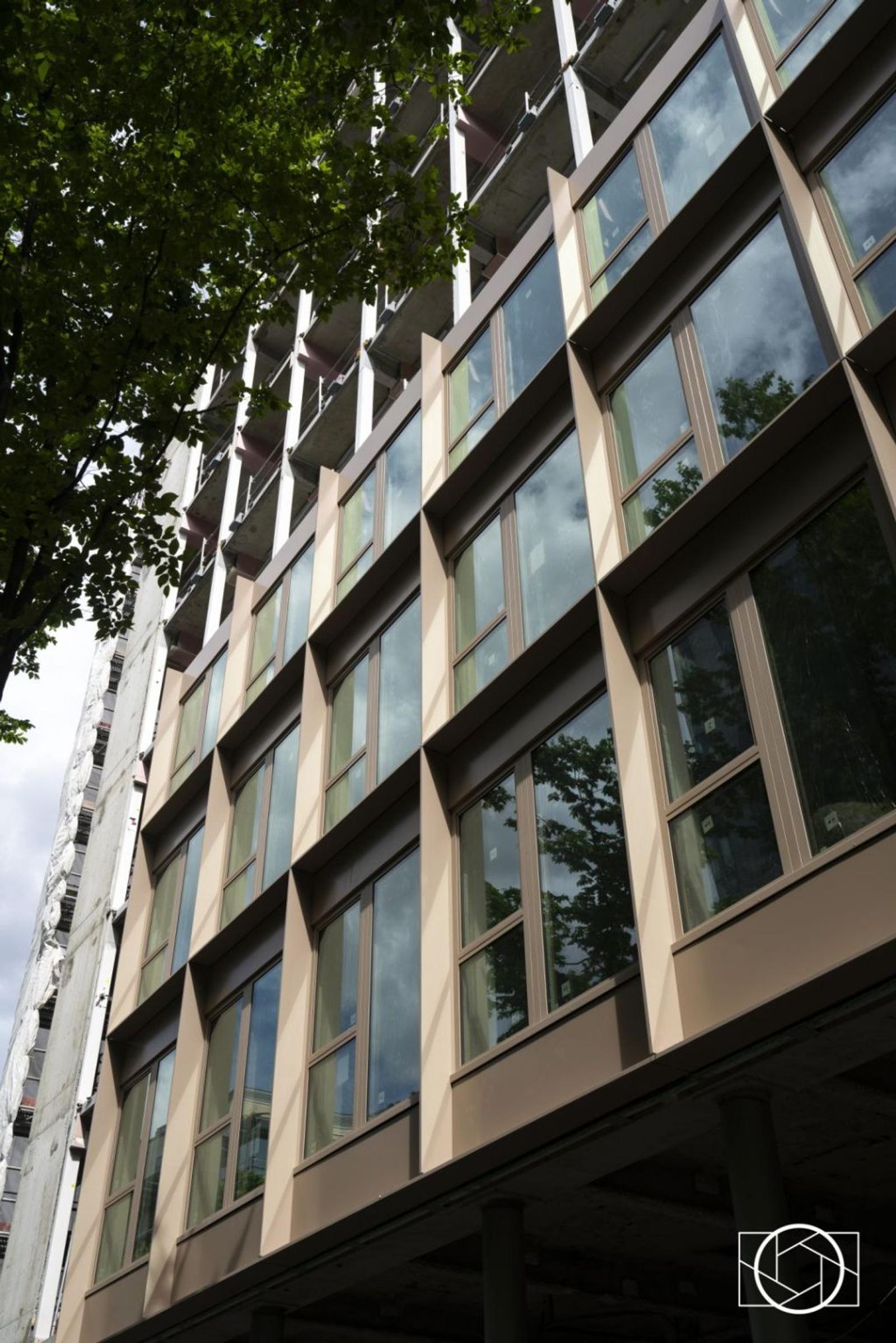 Pour répondre aux enjeux de délai du projet, le groupement LEGENDRE IDF / Atelier du Pont / VP GREEN s’est orienté vers une solution de Façades à Ossature Bois (FOB), réalisée avec l’entreprise ALLOUIS FACEINTEC. Des modules de façades préfabriqués de 5,4m x 3m intégrant bardages et brises soleils sont mis en place à l’aide d’une grue à tour permettant ainsi de réaliser les 3000m² de façades courantes dans un délai de moins de 3 mois. Au total, le chantier a duré 12 mois seulement.
