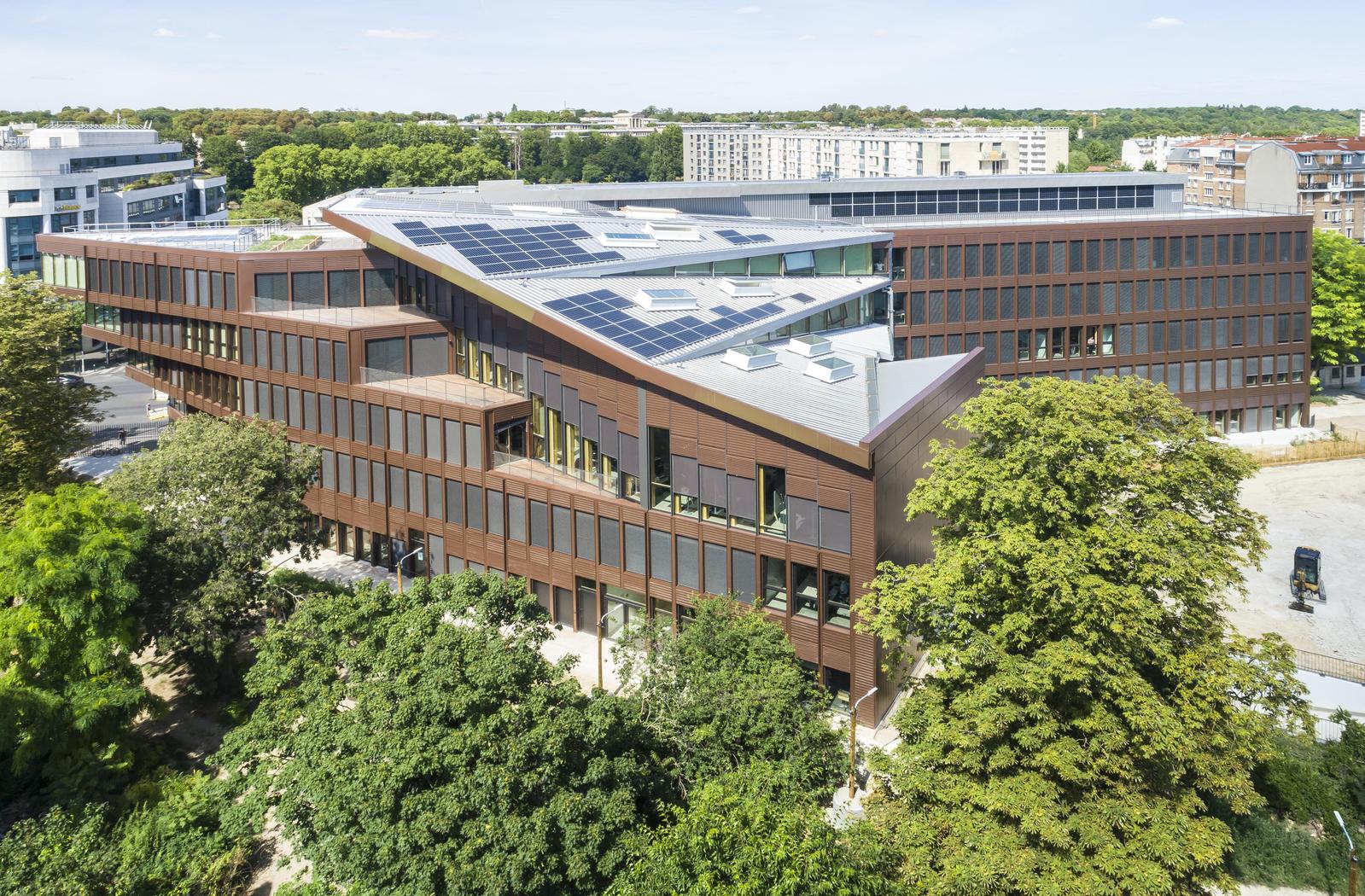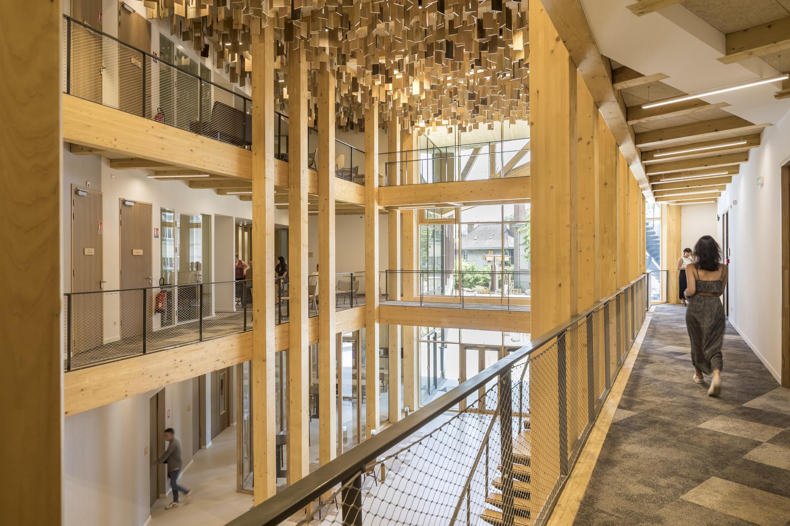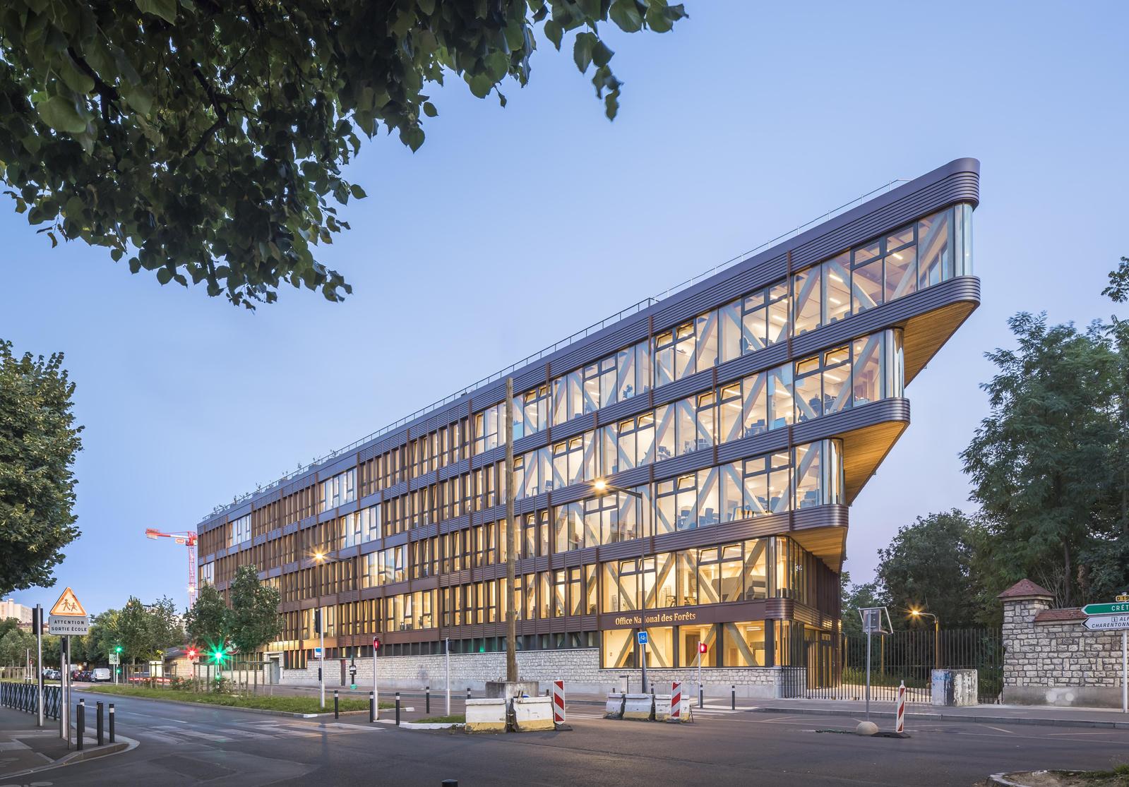 Cet immeuble de bureaux en R+5 accueille le siège social de l'Office National des Forêts à Maisons-Alfort, sur une surface de 7 650 m². Il est intégralement réalisé en bois français, depuis la structure jusqu'aux aménagements intérieurs. Circuit court oblige, charpentes, ossatures et planchers proviennent des forêts domaniales gérées par l'ONF. Le projet intègre un traitement acoustique et vibratoire complexe lié à la proximité du métro, et s’organise autour d’une rue intérieure lumineuse reliant les espaces de travail au jardin central.