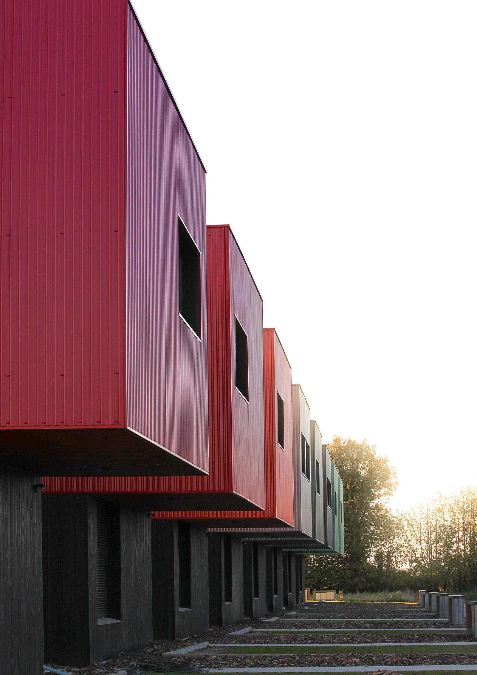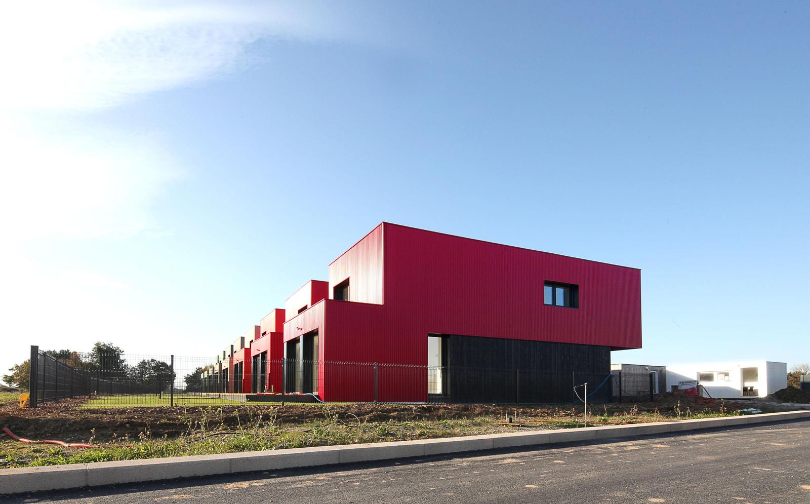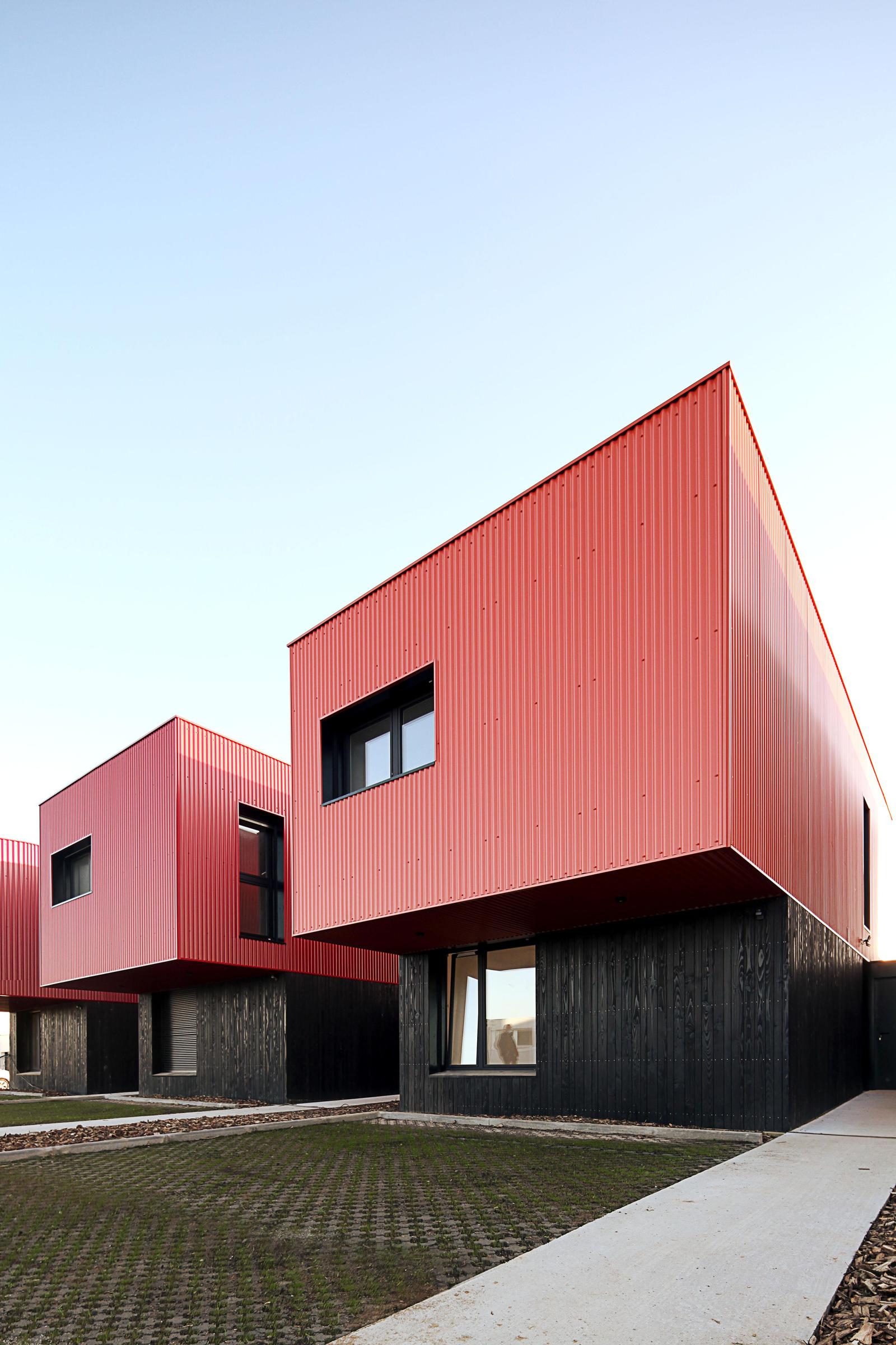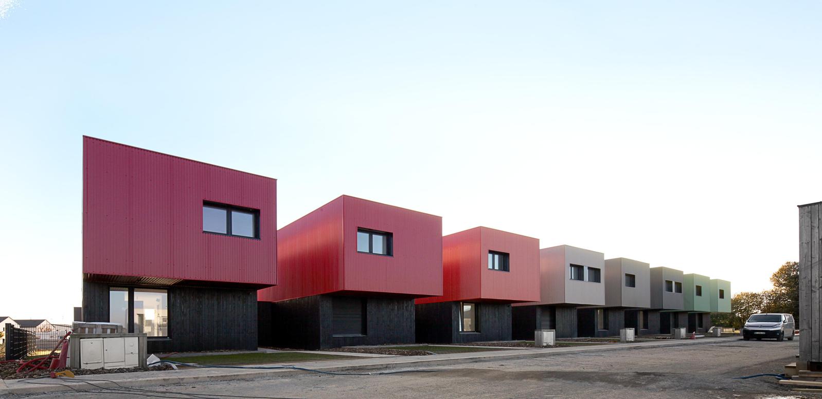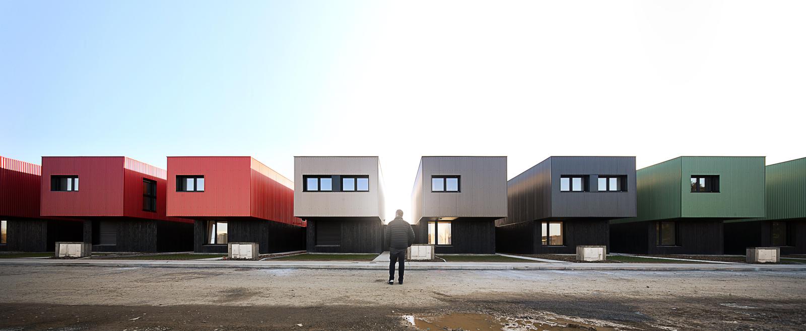 Chacun y trouvera la maison qui lui correspond, par l’association de deux matériaux (bardages bois noir et tôle métal laqué) conduisant à la réalisation de 8 maisons singulières, rassemblées de manière cohérentes.