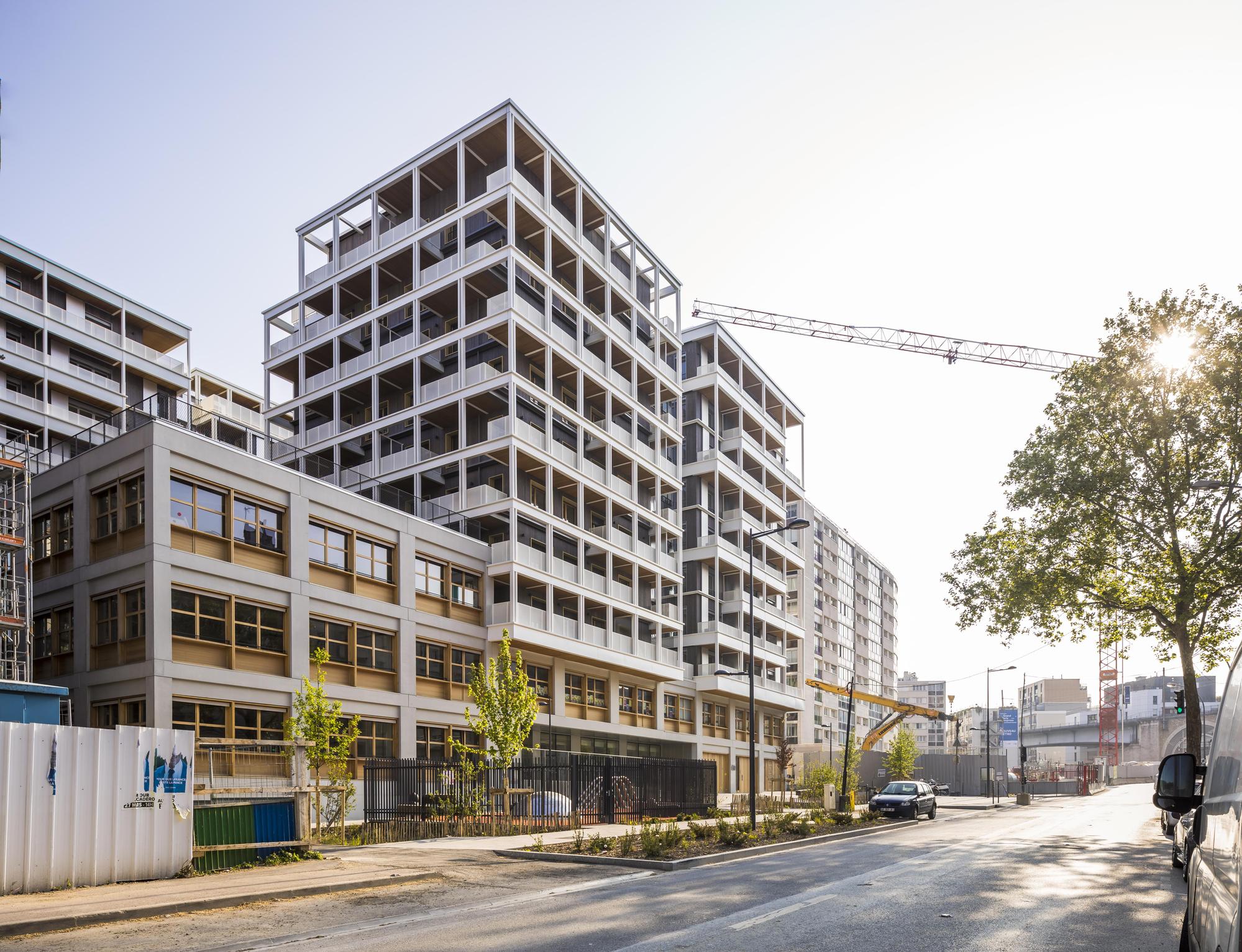 Travaux de construction de 104 logements (R+2 à R+9), d’une école maternelle (R+1) et d’un parc de stationnement. Pour ce projet, le bois a été privilégié à partir du R+2, non seulement pour la structure elle-même, mais également pour la réalisation des planchers et des murs.