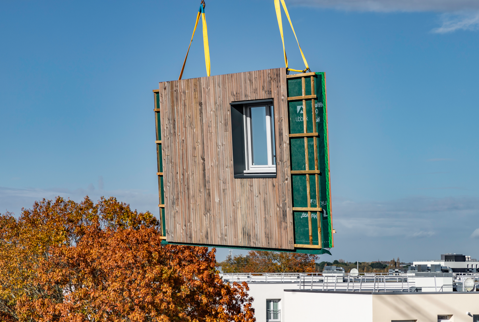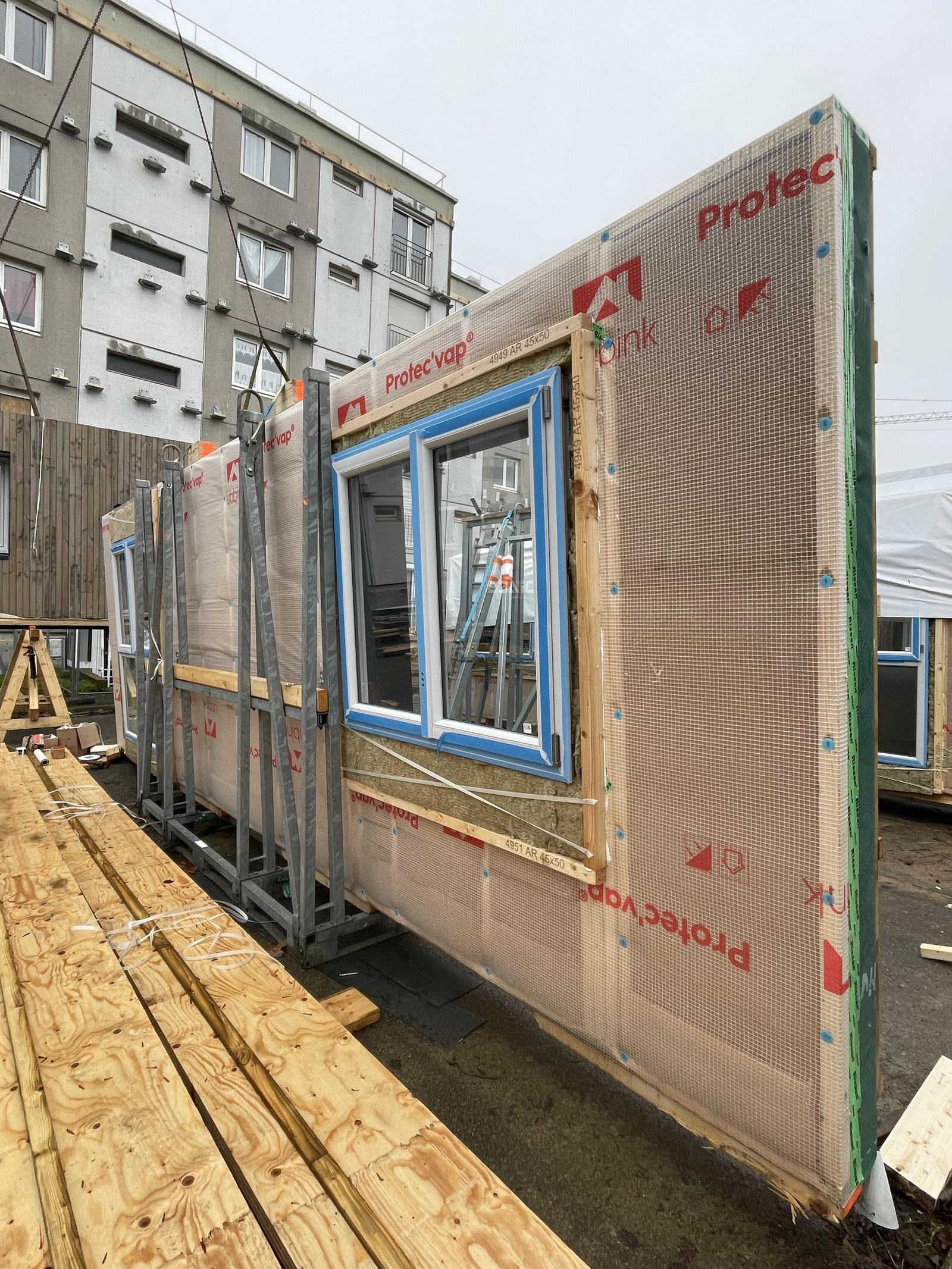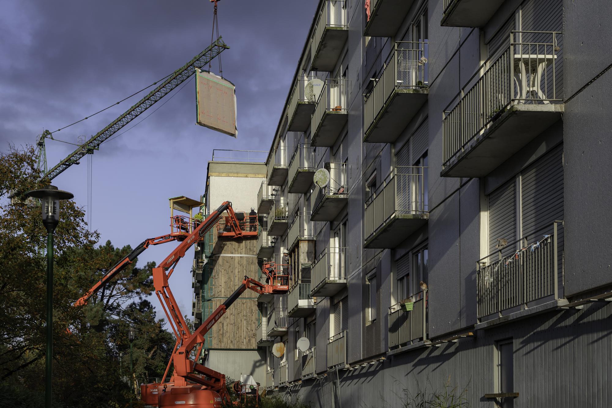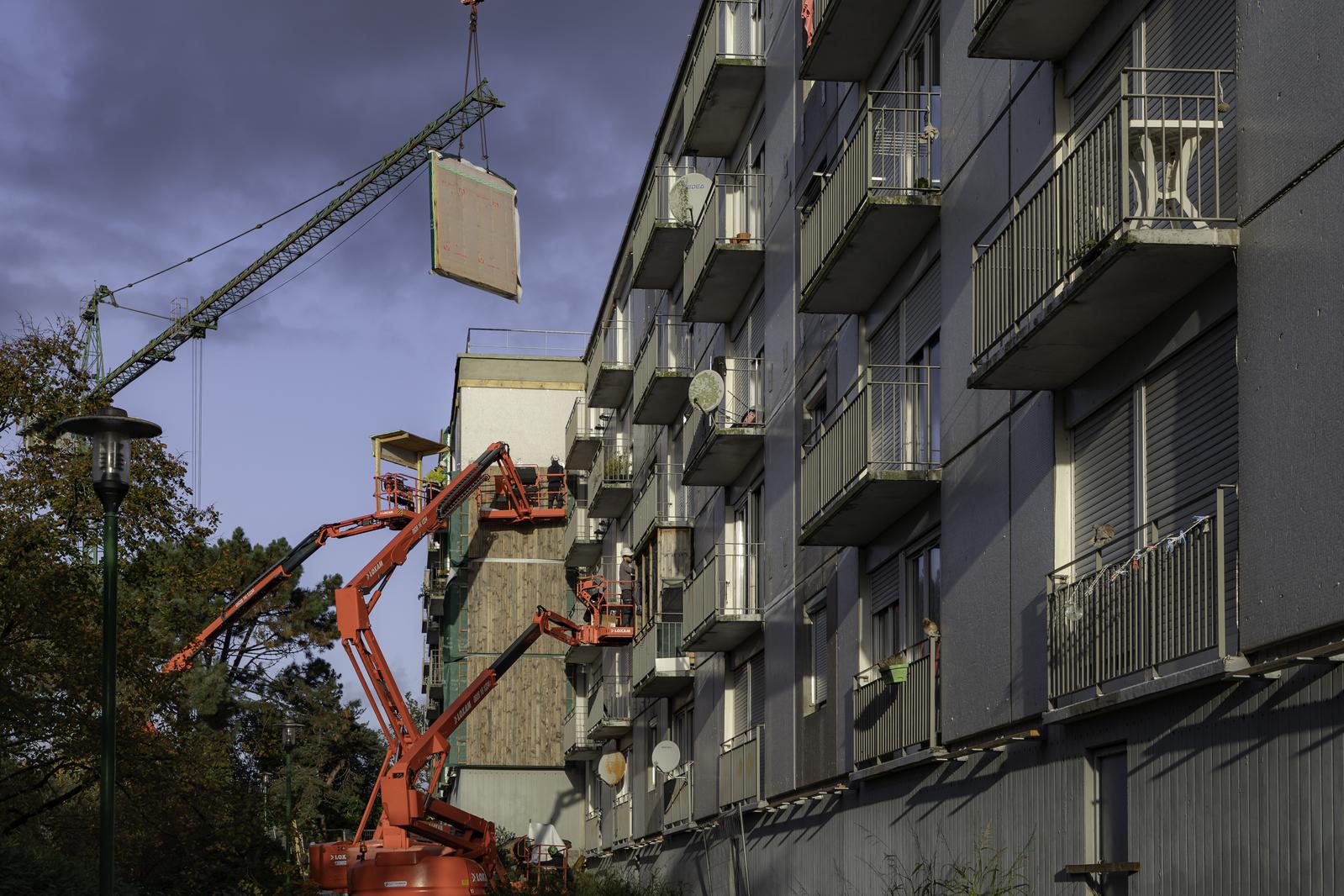 Le bois de l’ossature, permet une démarche de préfabrication optimisée, avec les systèmes de FOB. La légèreté de ces systèmes permet de se positionner sur des ouvrages existants sans risques de les surcharger. L’enjeu est de répondre à des sites occupés par les habitants, donc d’œuvrer rapidement pour limiter les nuisances lors du chantier (sonore, visuel etc.) pour les locataires restés sur site.