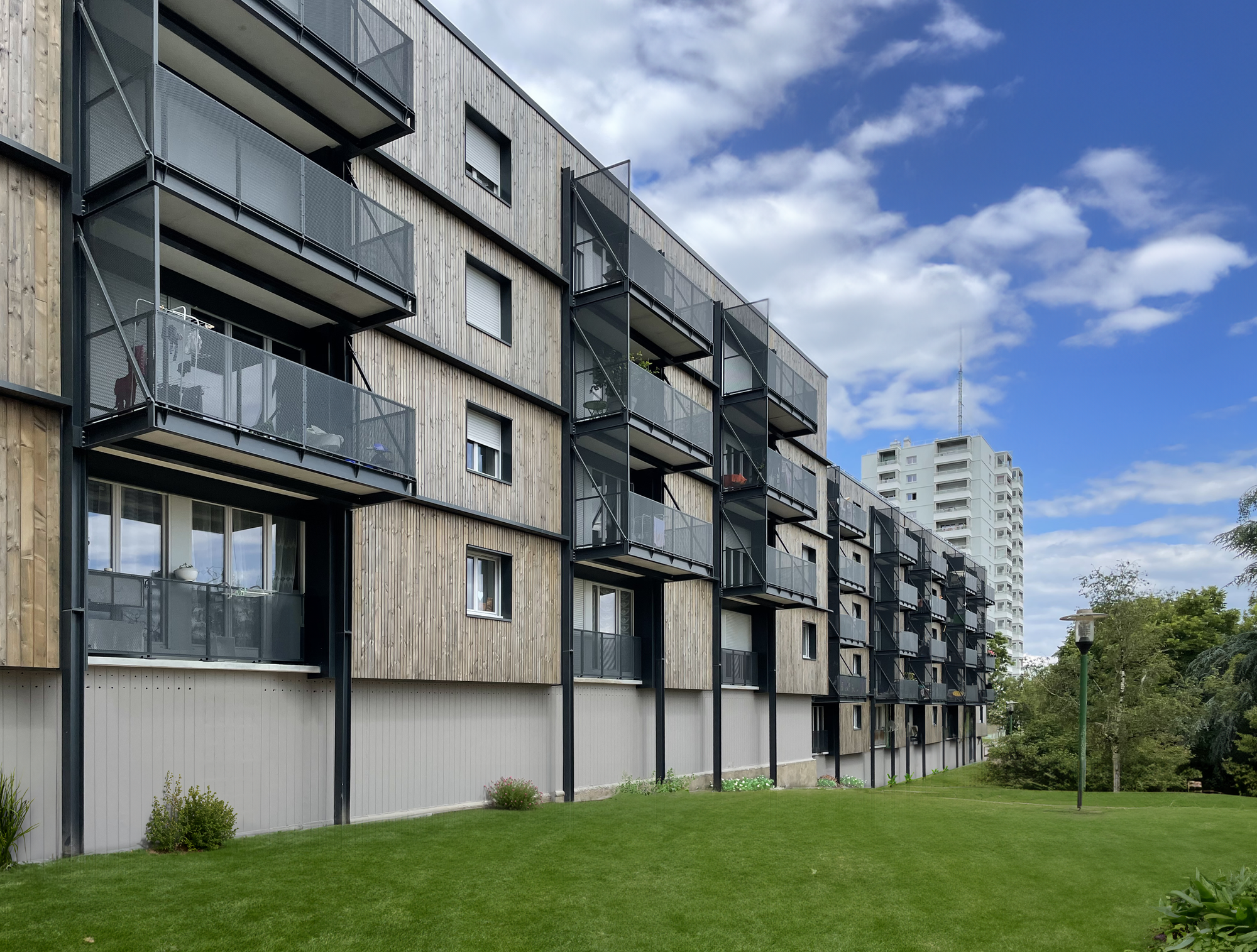 Afin de procéder à la réhabilitation thermique de ce bâtiment, nous avons mis en œuvre des panneaux préfabriqués en ossature bois (FOB), constitués d’une structure bois, d’un isolant biosourcé (laine de bois), d’un pare pluie, de nouvelles menuiseries avec un système d’occultation intégré, d’un revêtement en bardage bois, et le tout, assemblé directement en usine. Ces panneaux sont ensuite mis en œuvre avec des nacelles ou des grues et sont fixés sur l’ossature porteuse du bâti existant.